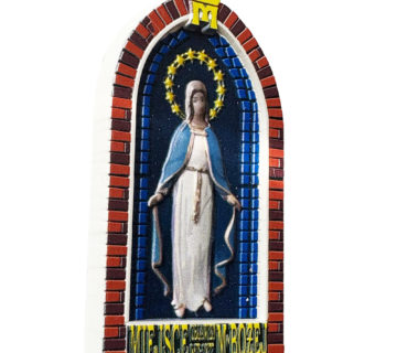 Ten wyjątkowy magnes przedstawia jedno z najważniejszych miejsc kultu maryjnego w Polsce – Sanktuarium Matki Bożej Gietrzwałdzkiej. Na pierwszym planie widzimy wizerunek Maryi ukazującej się dwóm klęczącym dziewczynkom, co nawiązuje do objawień z 1877 roku, uznanych przez Kościół katolicki za autentyczne. Postać Maryi otacza rozświetlona aureola w złocistych barwach, symbolizująca jej boską obecność i opiekę.