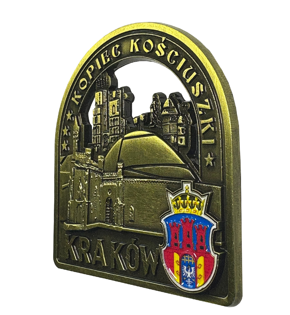 W tle magnesu widnieją charakterystyczne wieże krakowskich budowli, a całość uzupełnia herb miasta z koroną i trzema basztami, który podkreśla historyczny charakter stolicy Małopolski. Złoto-mosiężna tonacja nadaje pamiątce szlachetny, niemal medalierski charakter.