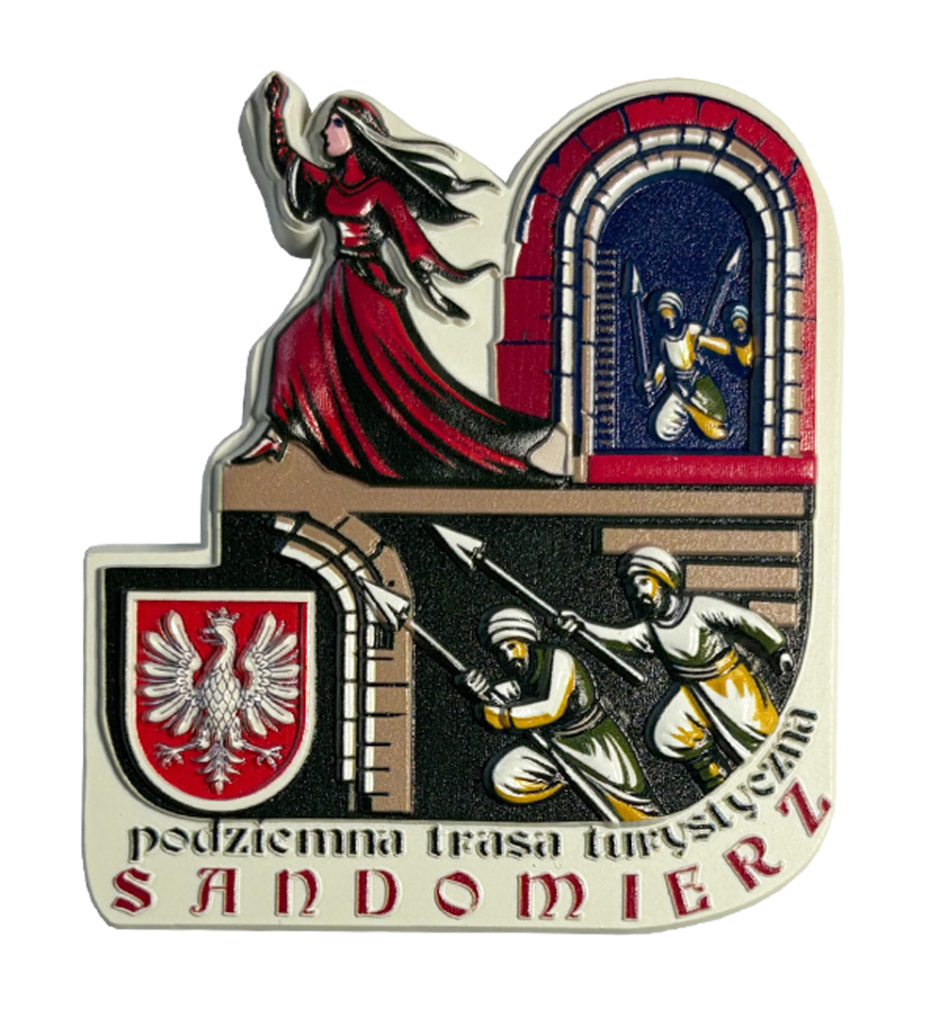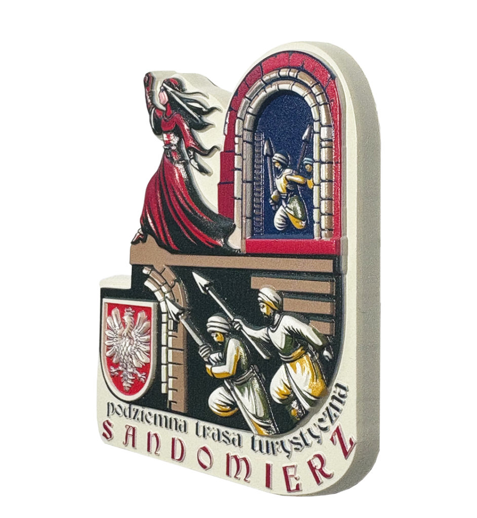 Ten wyjątkowy magnes ukazuje dramatyczną scenę z sandomierskiej legendy o Halinie Krępiance, która poświęciła własne życie, by ocalić miasto przed najazdem. Bohaterka w czerwonej sukni wskazuje drogę najeźdźcom, prowadząc ich przez mroczne podziemia. W tle widoczne są rycerskie postacie i łuki kamiennych korytarzy, które symbolizują sieć tuneli pod Sandomierzem. Całość dopełnia herb miasta, podkreślając historyczne znaczenie tej opowieści.