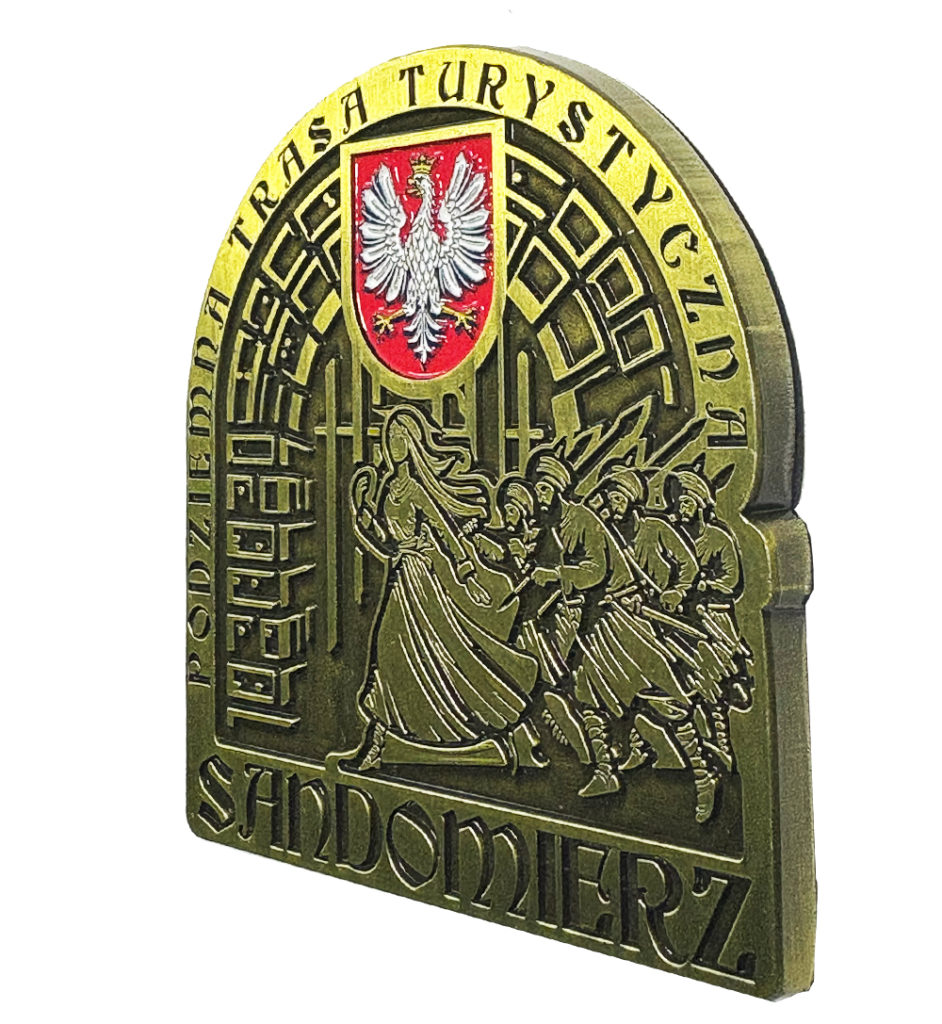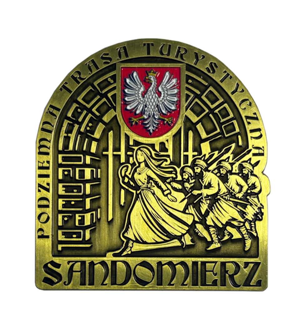 Tło przypomina korytarze lochów, a nad wszystkim góruje herb Sandomierza – podkreślający dumę i tożsamość miasta. Całość utrzymana jest w stylu retro z dominacją złota i czerni, co nadaje magnesowi wyjątkowej elegancji i kolekcjonerskiej wartości.