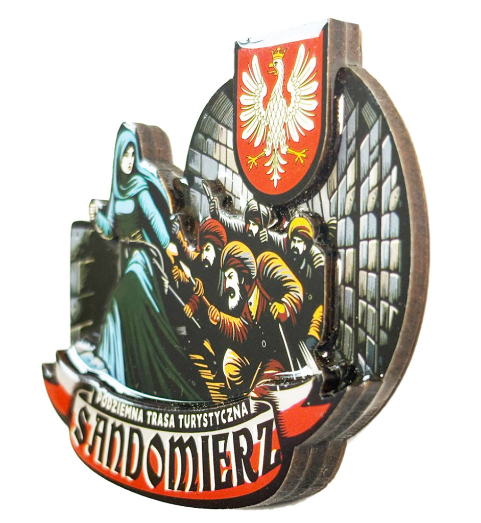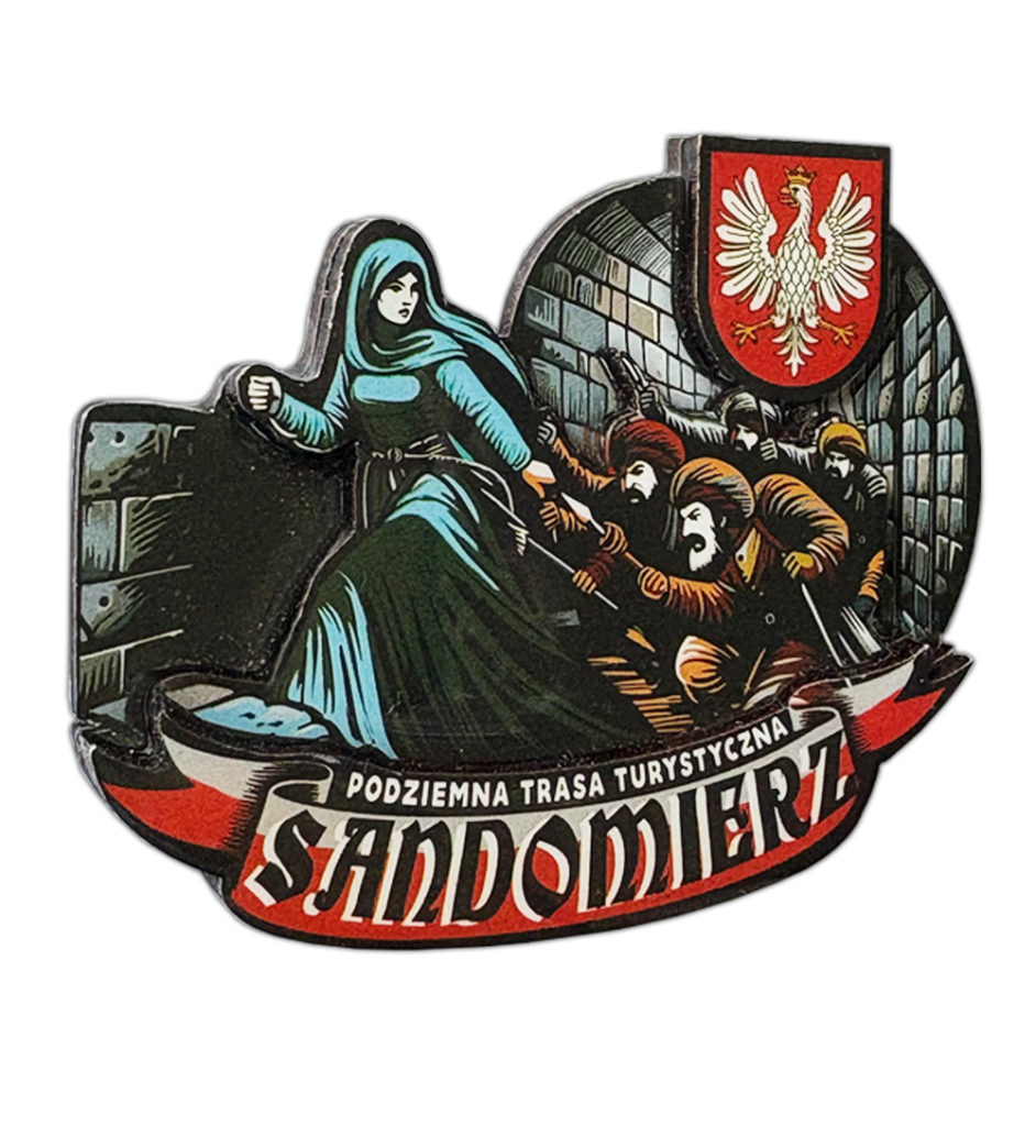 Magnes przedstawia jedną z najbardziej intrygujących atrakcji Sandomierza – Podziemną Trasę Turystyczną, zainspirowaną legendą o dzielnej Halinie Krępiance. Na pierwszym planie widzimy kobietę w średniowiecznym stroju, prowadzącą grupę rycerzy przez mroczne korytarze pod miastem. Nad sceną umieszczono herb Sandomierza z białym orłem na czerwonym tle, dodający magnesowi oficjalnego charakteru. Dynamiczna kompozycja i kontrastowe kolory oddają napięcie i dramatyzm tej historycznej opowieści.